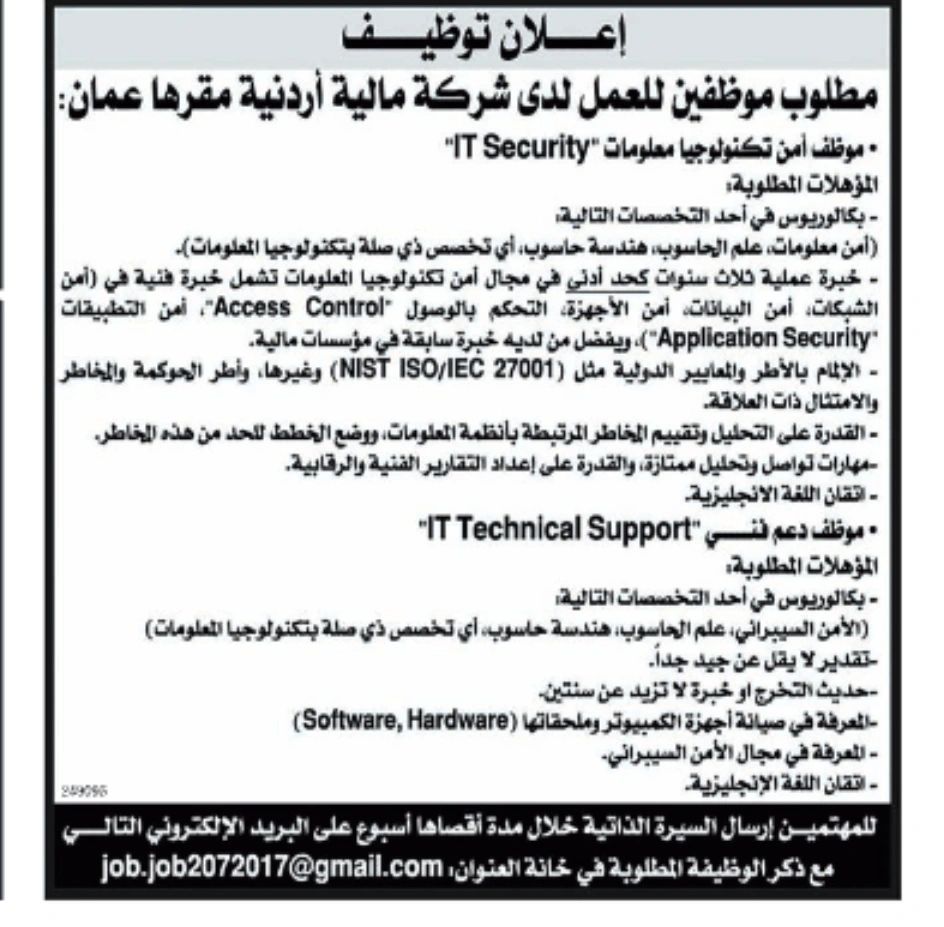 تعلن شركة مالية أردنية مقرها عمان عن توفر وظائف تقنية معلومات 2025 في المجالات التالية: