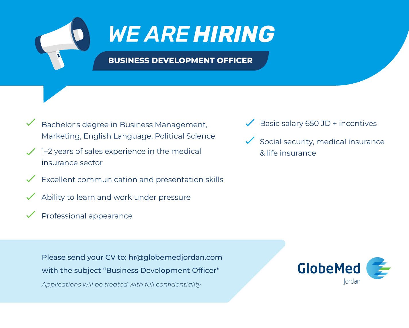 تُعلن شركة GlobeMed الأردن في عمان عن حاجتها لتوظيف موظف تطوير أعمال (Business Development Officer) وفقًا للشروط التالية: