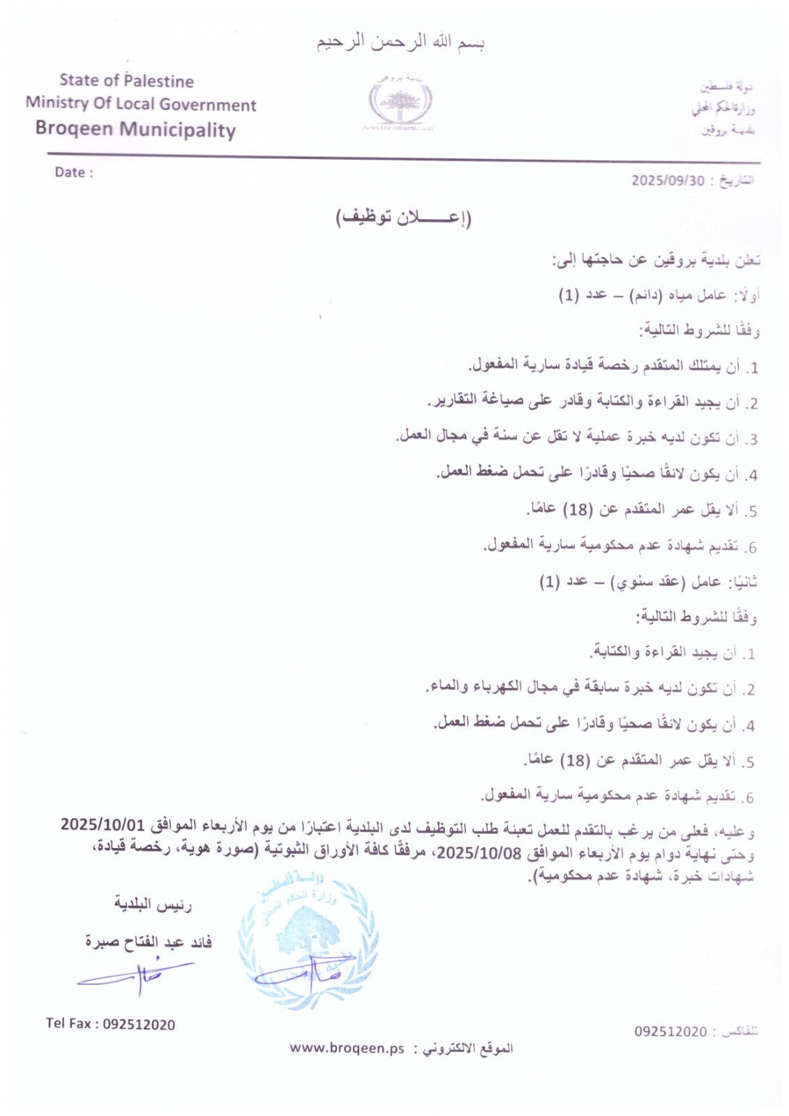 📢 وظائف بلدية بروقين – سلفيت 2025