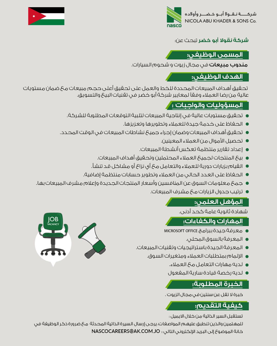 شركة نقولا أبو خضر وأولاده (NASCO) تعلن عن توفر شاغر وظيفي لمندوب مبيعات متخصص في مجال الزيوت وشحوم السيارات للعمل في الأردن.