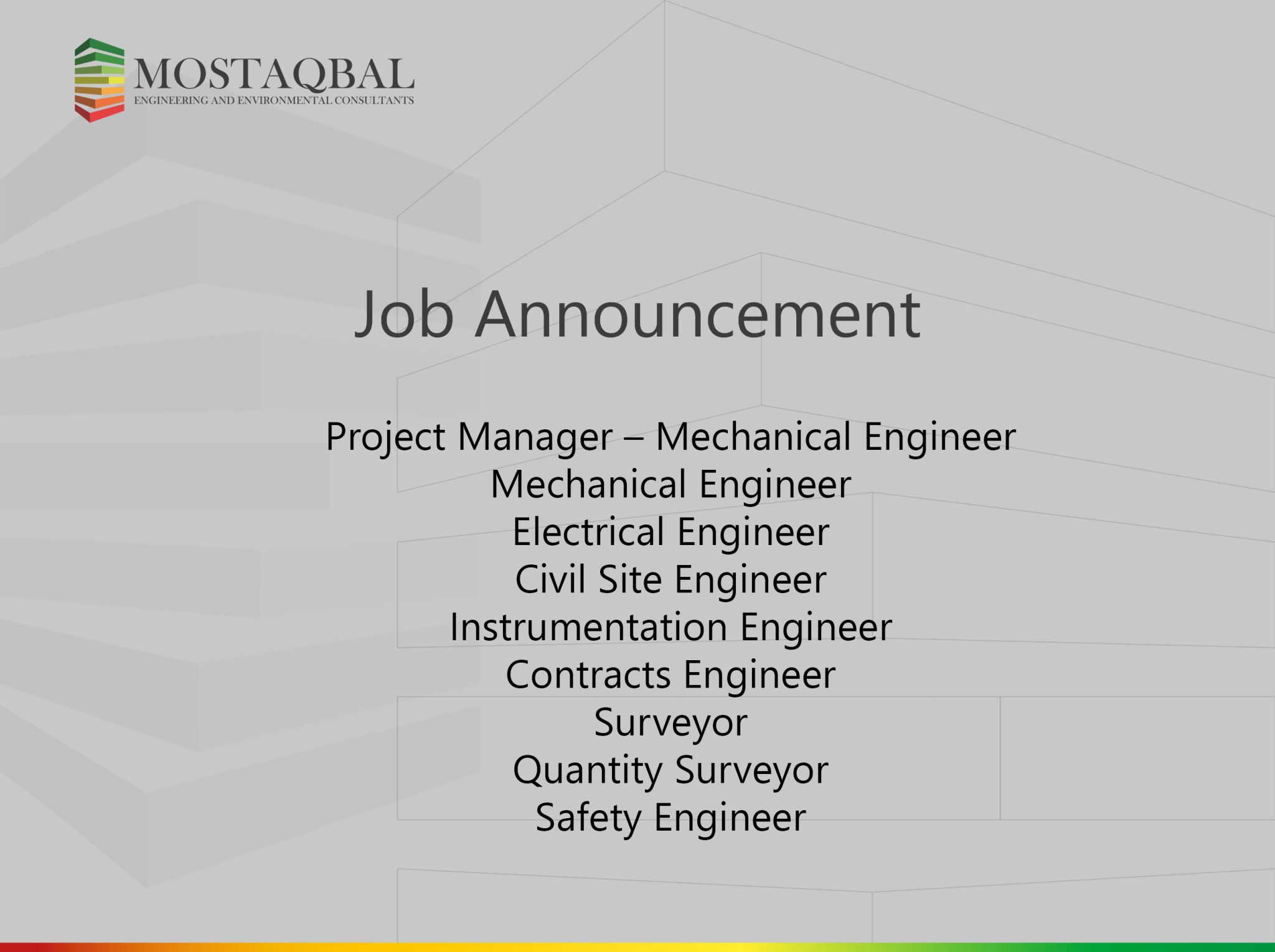 تعلن شركة Mostaqbal عن فتح باب التوظيف لمجموعة من المهندسين والفنيين للعمل في مشروع في العقبة – الأردن ضمن قطاع النفط والغاز.