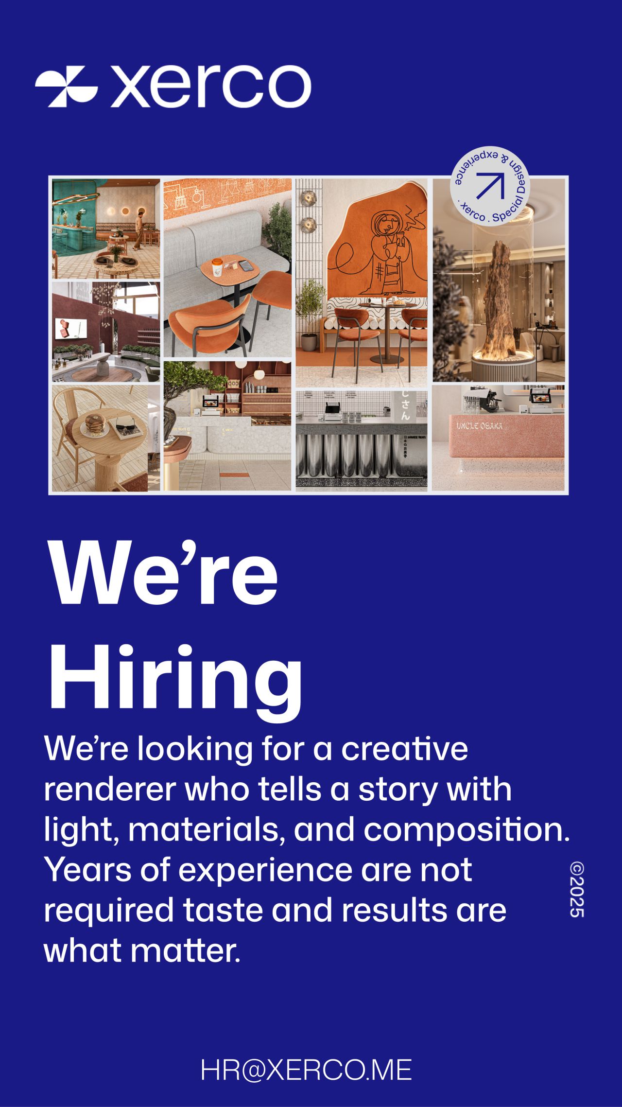 تعلن شركة XERCO عن حاجتها إلى مصمم رندر مبدع قادر على سرد قصة من خلال الإضاءة والمواد والتكوين الفني، للعمل على مشاريع المطاعم والمقاهي في مدينة عمّان.