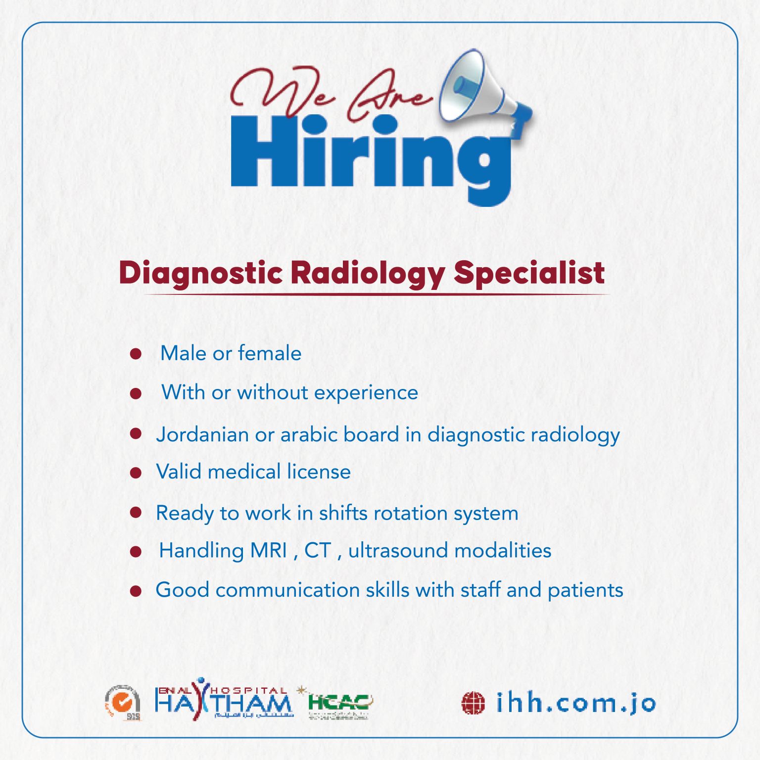 • ✅ حاصل على البورد الأردني أو العربي في الأشعة التشخيصية.