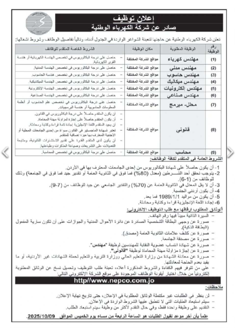 شركة الكهرباء الوطنية في الأردن تُعلن عن حاجتها إلى موظفين في التخصصات الهندسية والتقنية لعام 2025. وظائف متنوعة تشمل مهندسين في مجالات متعددة مثل الكهرباء، الحاسوب، الميكانيكا، والصناعات. تابع التفاصيل وتقدّم للوظائف في مدينة عمان وغيرها من المواقع.