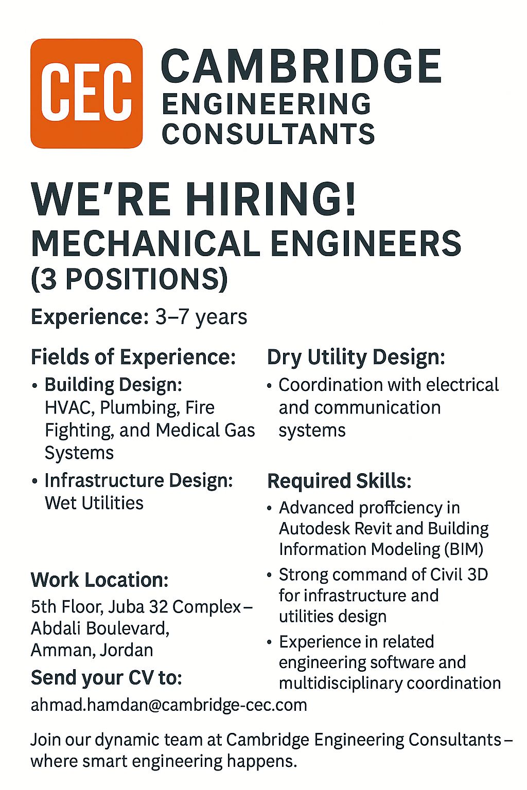 تعلن شركة Cambridge Engineering Consultants (CEC) عن توفر 3 شواغر لوظيفة مهندس ميكانيك بخبرة من 3 إلى 7 سنوات، للانضمام إلى فريقها في عمّان.