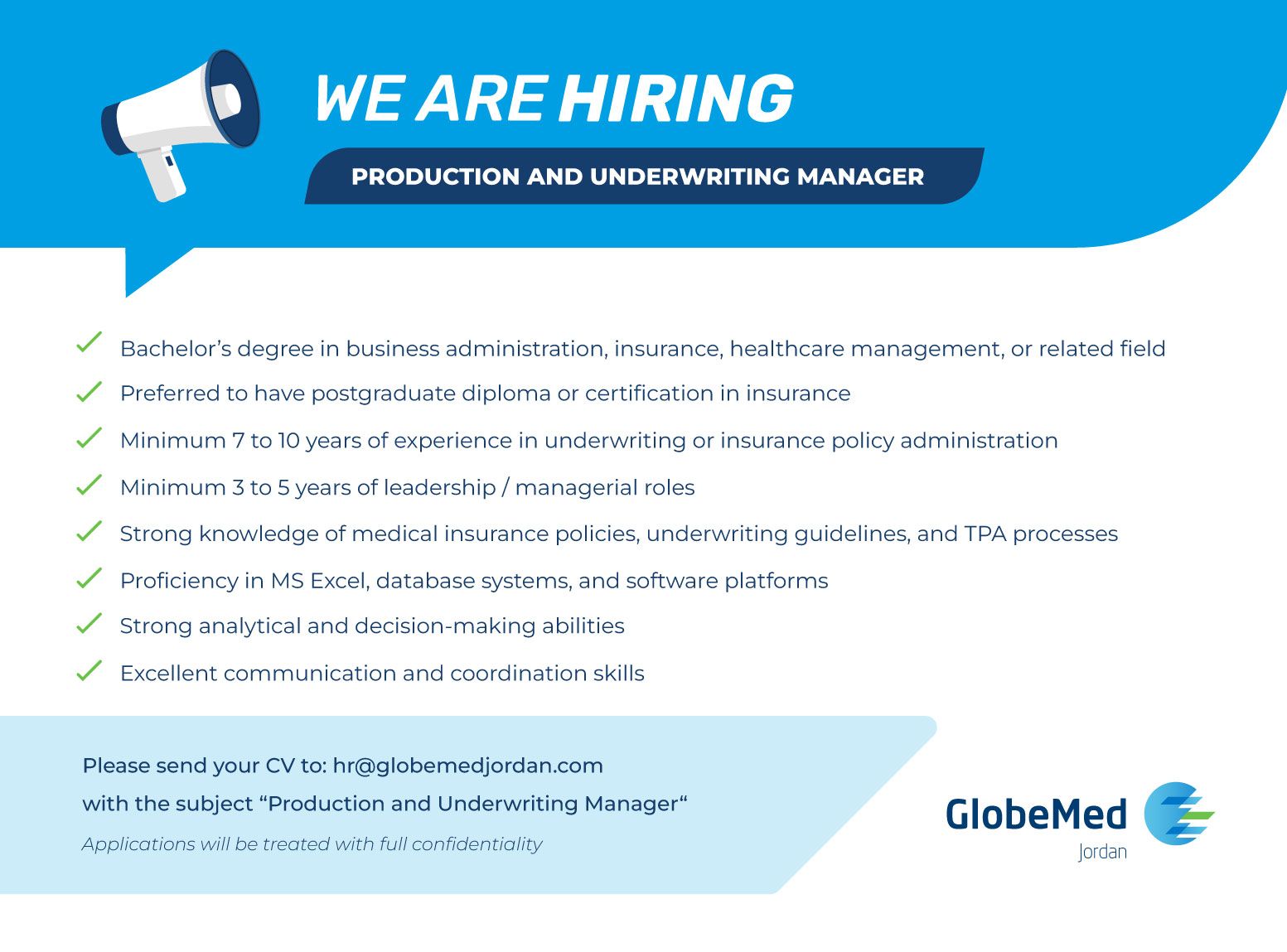 هل تبحث عن وظيفة قيادية في مجال التأمين الطبي؟ انضم إلى فريقنا كـ مدير الإنتاج والاكتتاب (Production and Underwriting Manager) وكن جزءًا من شركة رائدة في مجال التأمين الصحي في عمّان.