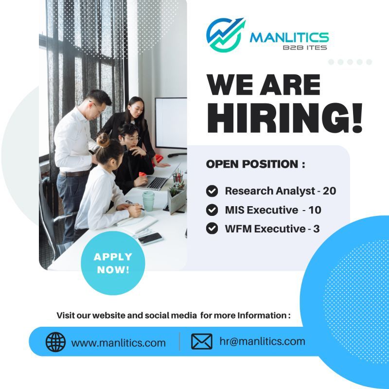 تعلن شركة Manlitics B2B ITES عن حاجتها لتعيين عدد من الموظفين الجدد في مجالات التحليل وإدارة المعلومات والقوى العاملة. إذا كنت تبحث عن وظيفة تقنية أو تحليلية، فهذه فرصتك!