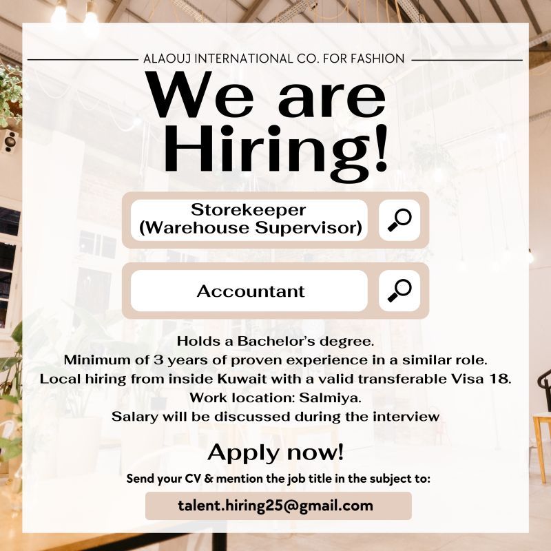 تعلن شركة ALAOJ International Co. for Fashion عن توفر وظائف شاغرة في تخصصات المحاسبة والمخازن (Warehouse) للعمل بموقعها في السالمية، الكويت.