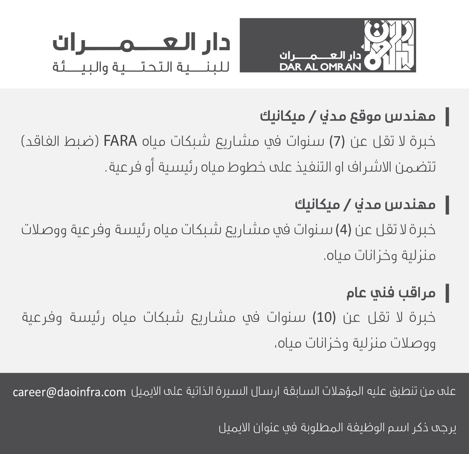 تعلن شركة دار العمران عن توفر وظائف هندسية وفنية في مدينة عمّان، الأردن، ضمن مشاريع شبكات المياه، وفق التفاصيل التالية:
