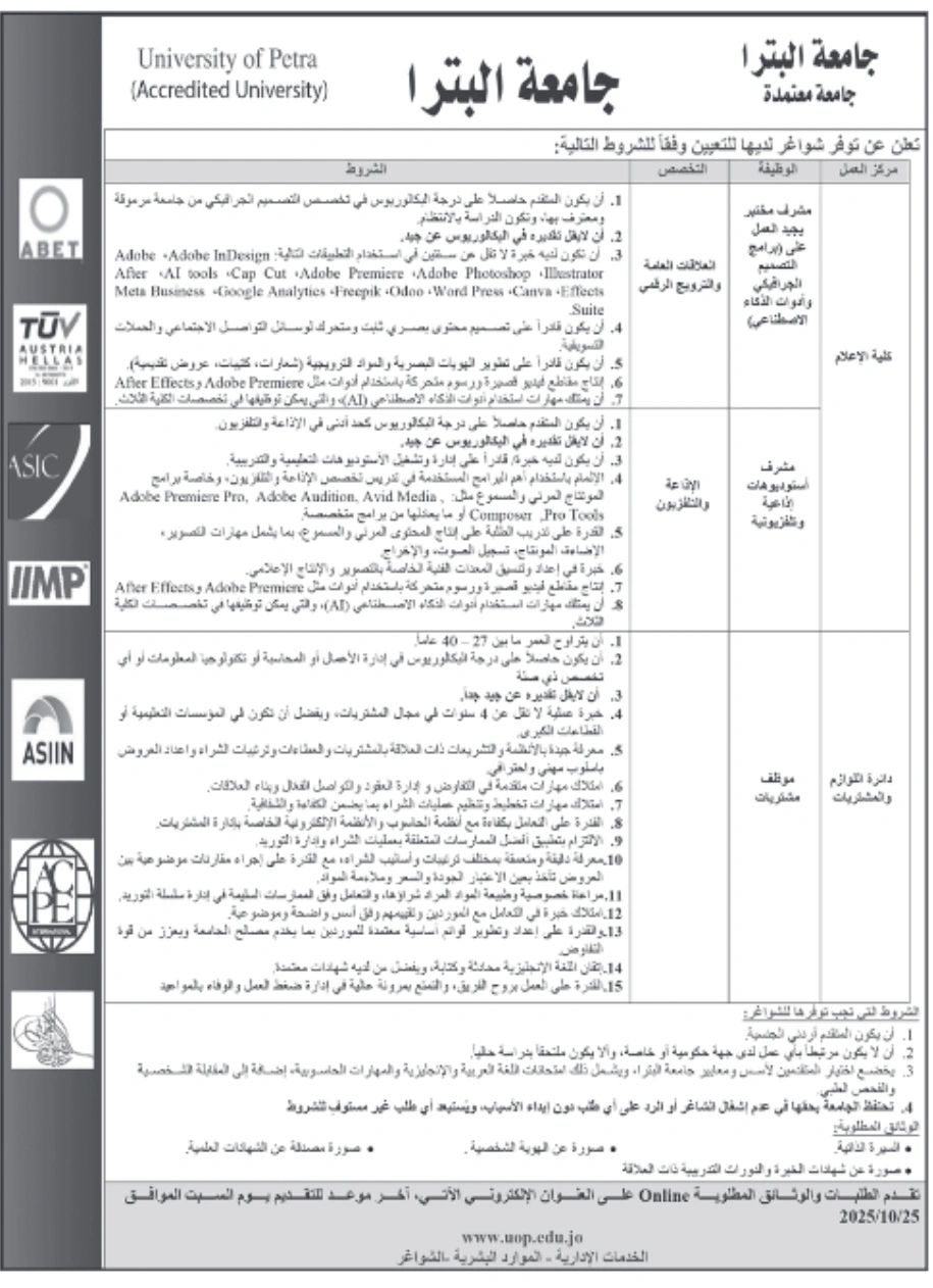 وظائف شاغرة تخصصات إعلام جامعة البتراء 2025