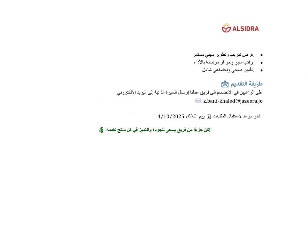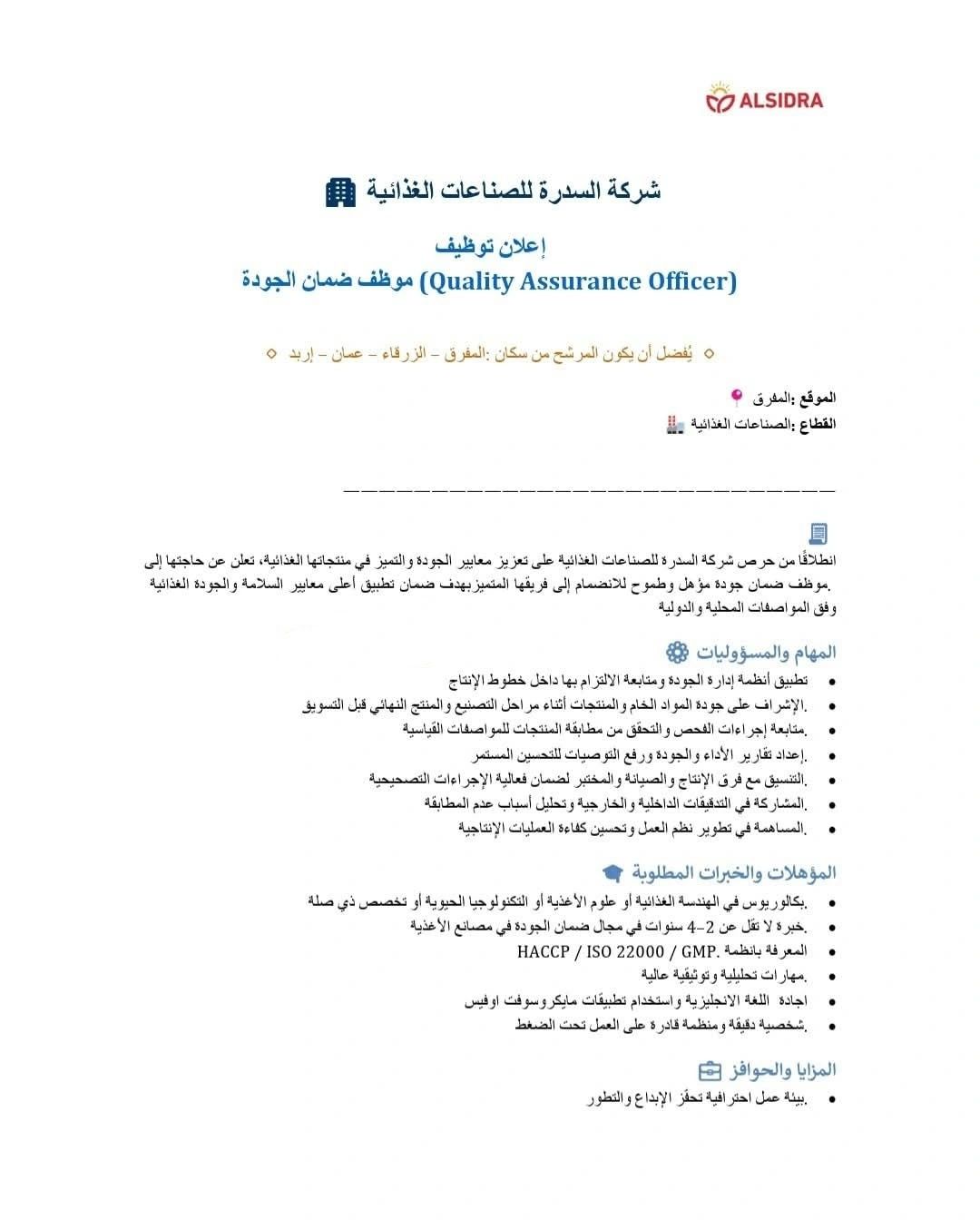 تُعلن شركة السدرة للصناعات الغذائية عن حاجتها لتعيين موظف/ة ضمان جودة (Quality Assurance Officer) للعمل في أحد فروعها في مدينة إربد، مع أفضلية لسكان: الزرقاء، الرصيفة، عمان – طريق المطار.