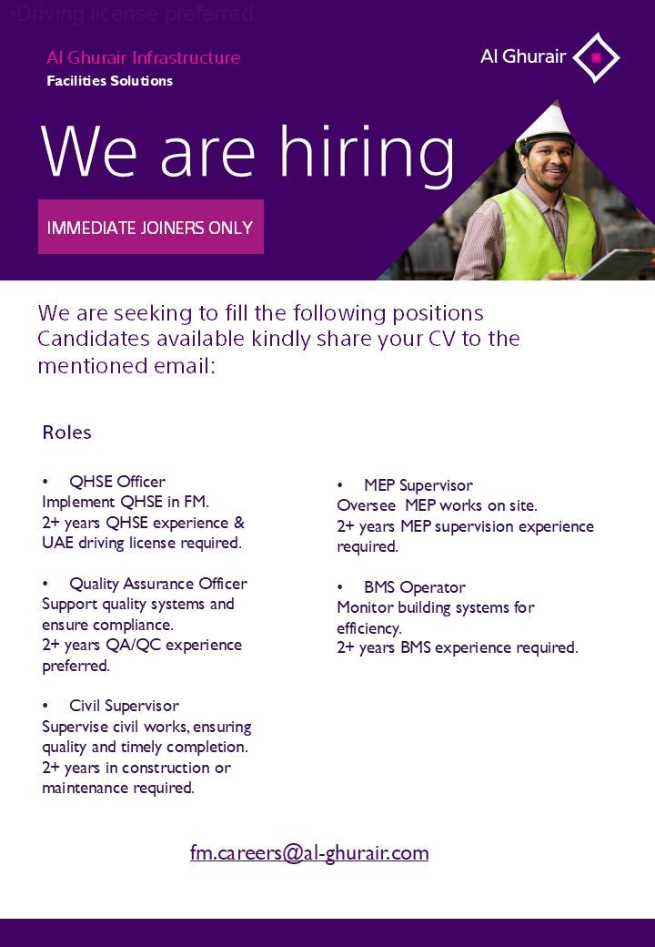 تعلن Al Ghurair Infrastructure – Facilities Solutions عن فتح باب التوظيف العاجل في عدد من التخصصات الفنية والهندسية. الوظائف متاحة للانضمام الفوري فقط، ويُفضّل من لديهم إقامة سارية داخل الإمارات.