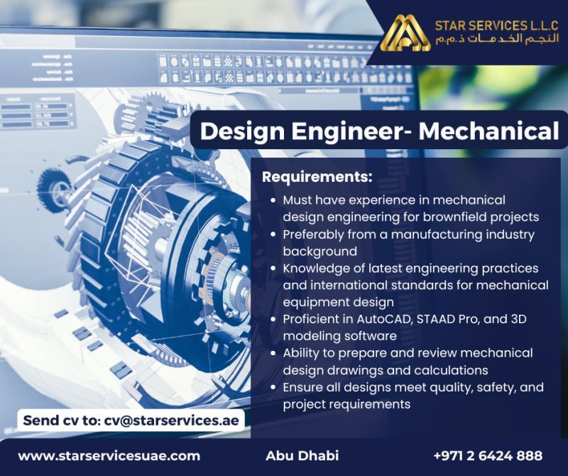 تعلن شركة Star Services في أبوظبي عن توفر وظيفة مهندس تصميم ميكانيكي للعمل ضمن مشاريع هندسية متقدمة.