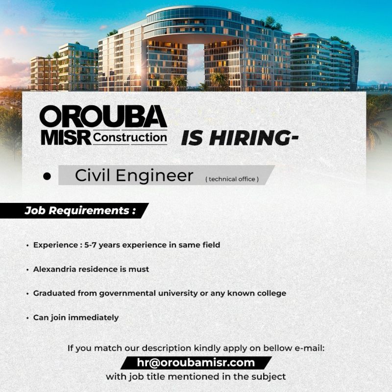 تعلن شركة Orouba Misr Construction عن حاجتها لتعيين مهندس مدني – Civil Engineer للعمل في المكتب الفني في مدينة الإسكندرية، ضمن وظائف الهندسة لعام 2025.