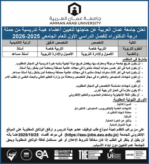 تُعلن جامعة عمان العربية في الأردن عن حاجتها إلى تعيين أعضاء هيئة تدريس من حملة درجة الدكتوراه للعمل في الفصل الدراسي الأول للعام الجامعي 2025-2026، في الكليات والتخصصات التالية: