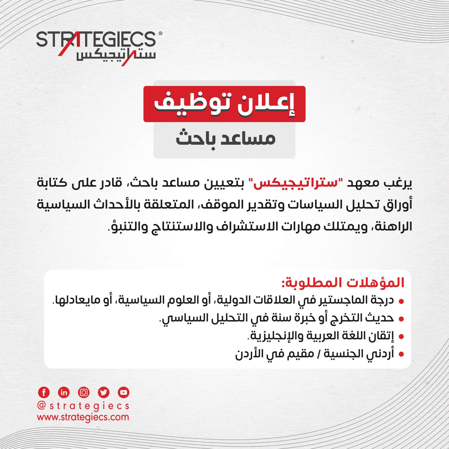 يُعلن معهد ستراتيجيكس في عمّان عن حاجته لتعيين مساعد باحث متخصص في إعداد أوراق تحليل السياسات وتقدير المواقف السياسية الراهنة، ويجيد مهارات التحليل، الاستشراف، والتنبؤ بالتطورات.
