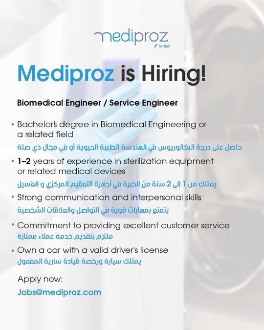 تعلن شركة Mediproz في الأردن عن حاجتها لتعيين مهندس أجهزة طبية أو مهندس خدمات ميدانية ذو كفاءة وخبرة للانضمام إلى فريقها المتخصص في أجهزة التعقيم والمعدات الطبية.