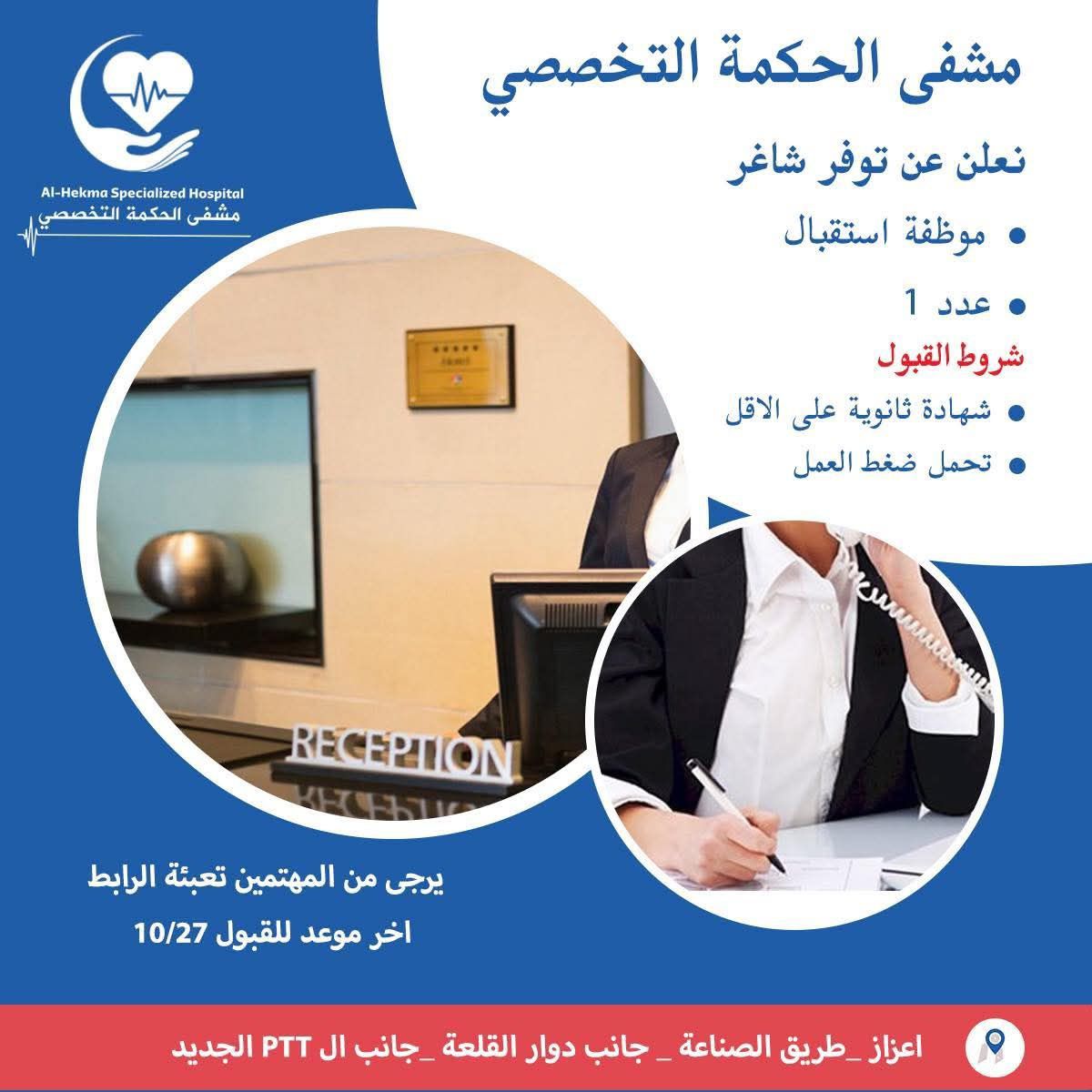 وظيفة موظفة استقبال في مشفى الحكمة التخصصي