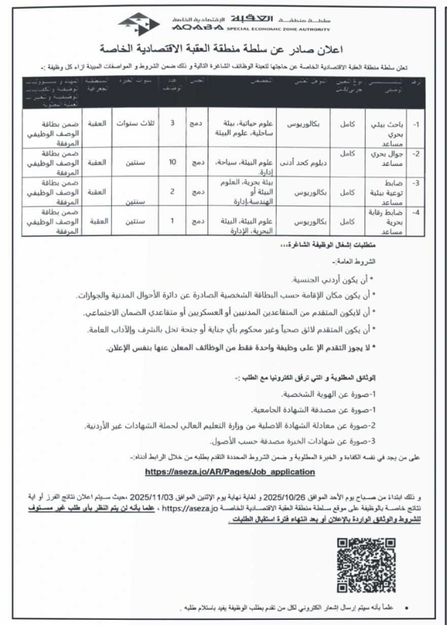 تعلن سلطة منطقة العقبة الاقتصادية الخاصة عن حاجتها لتعبئة عدد من الوظائف الشاغرة وفقًا للشروط والمواصفات التالية: