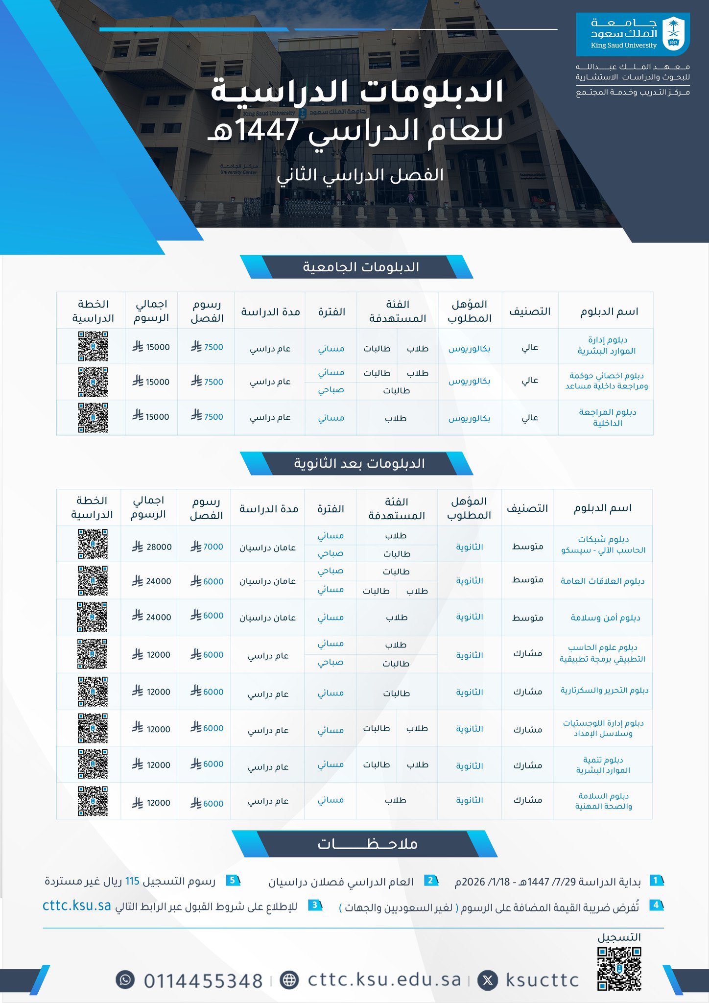 يعلن مركز التدريب وخدمة المجتمع التابع لـ جامعة الملك سعود عن فتح باب القبول والتسجيل في مجموعة متنوعة من برامج الدبلومات الجامعية والدبلومات بعد الثانوية، وذلك للفصل الدراسي الثاني من العام الجامعي 1447هـ.