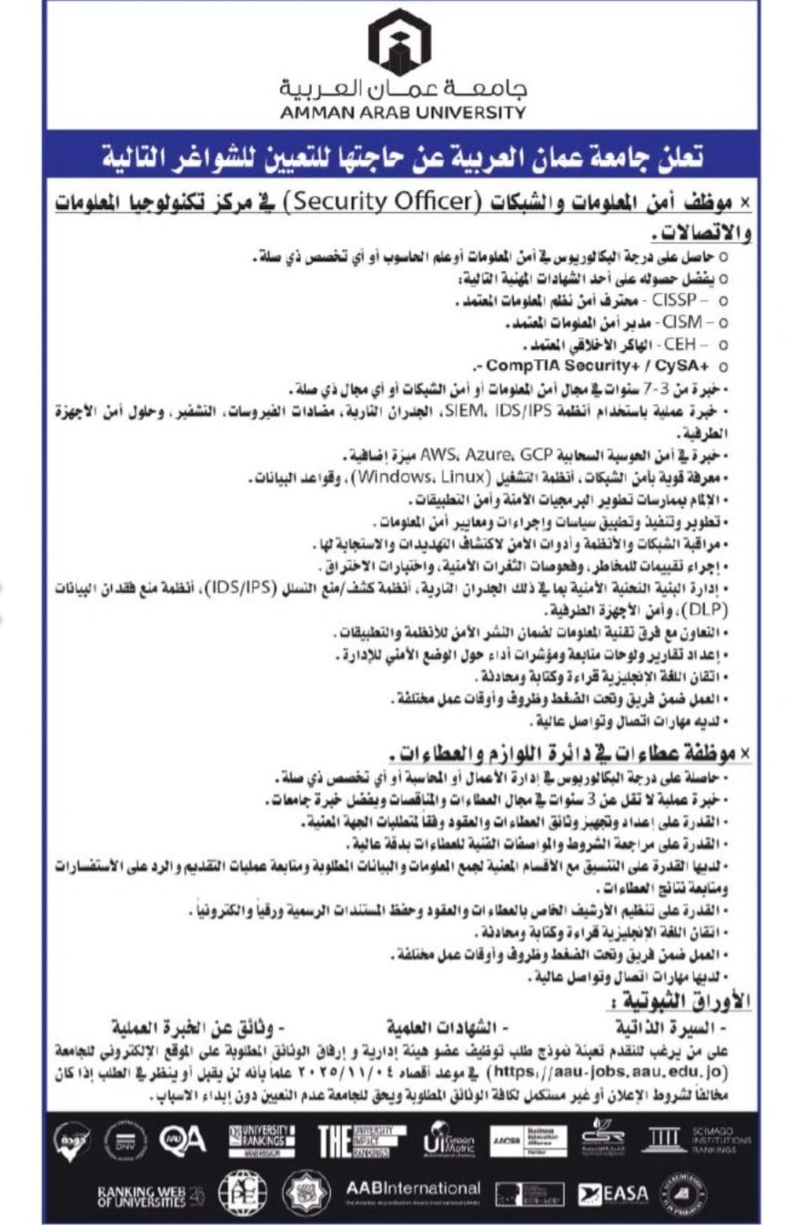 تعلن جامعة عمان العربية عن حاجتها إلى تعيين موظف في مجال أمن المعلومات والشبكات، وفقًا للشروط التالية: