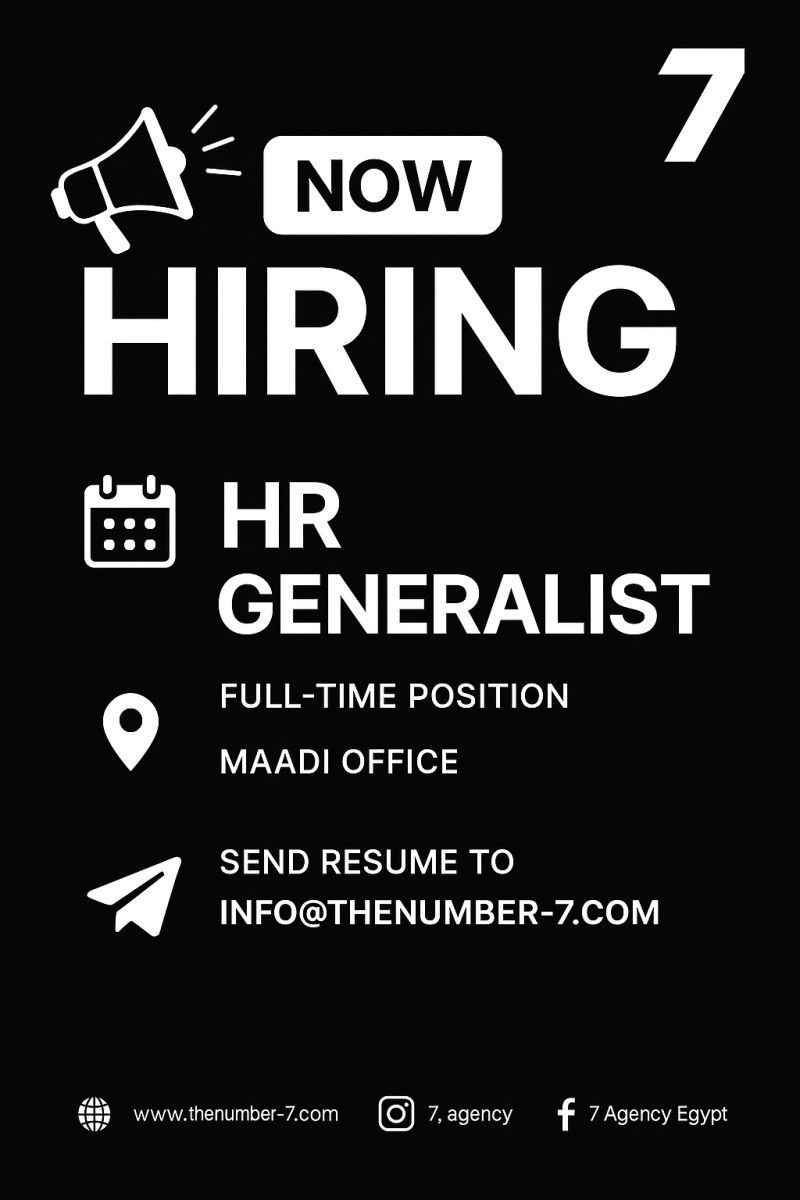تبحث 7 Agency عن أخصائي موارد بشرية (HR Generalist) للانضمام إلى فريقها في مكتب المعادي بدوام كامل.