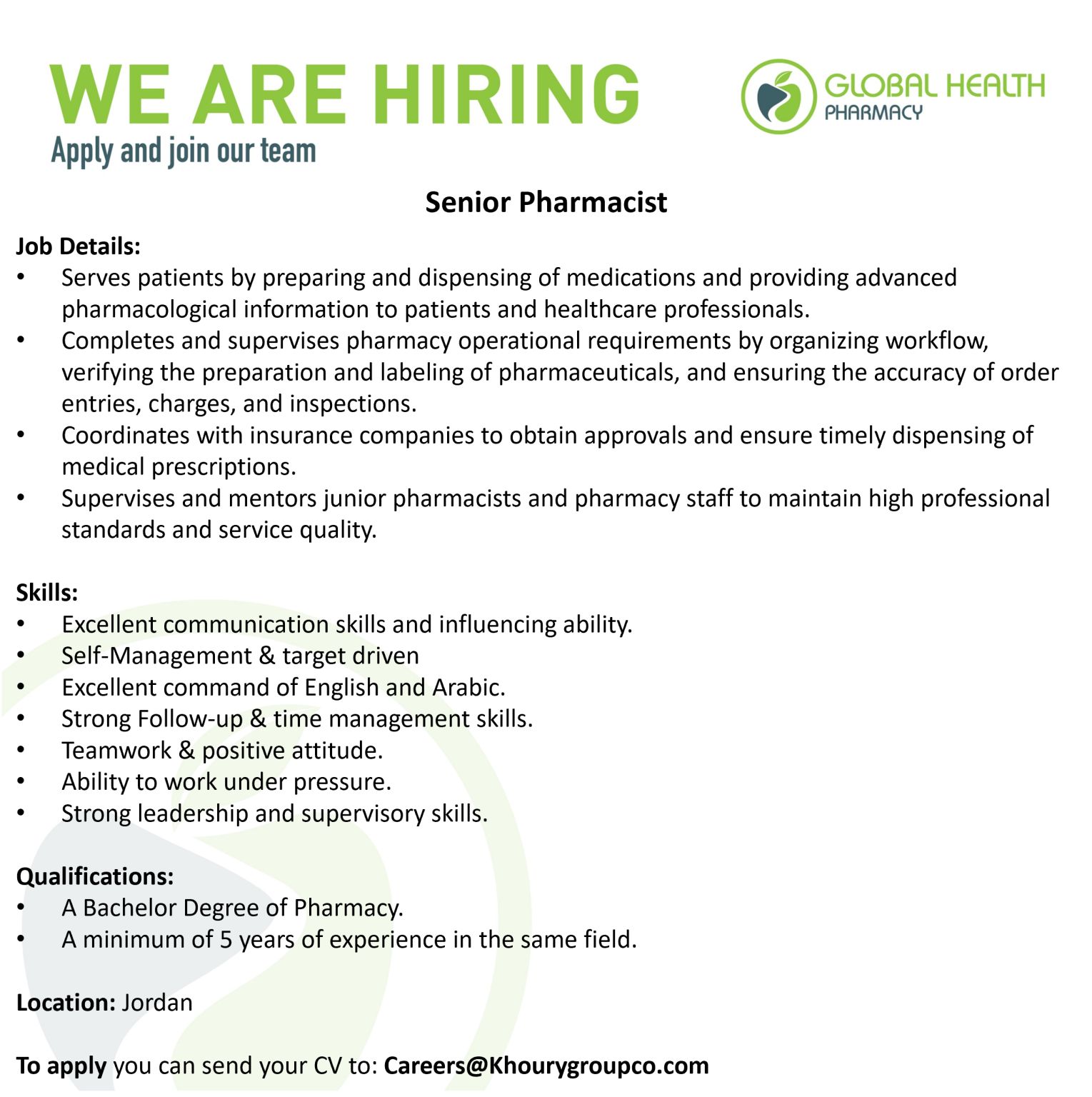 ✅ المسمى الوظيفي: صيدلي أول – Senior Pharmacist
