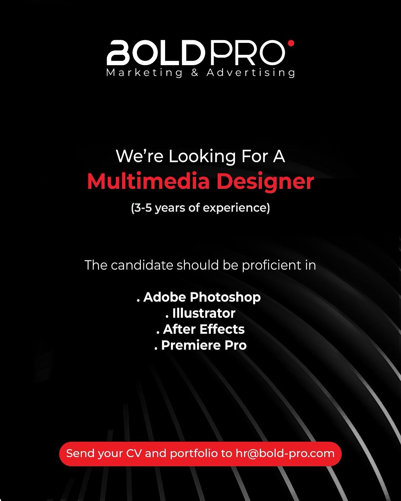 نبحث في BoldPro Marketing & Advertising عن مصمم وسائط متعددة (Multimedia Designer) للانضمام إلى فريقنا في عمّان – الأردن 🎨