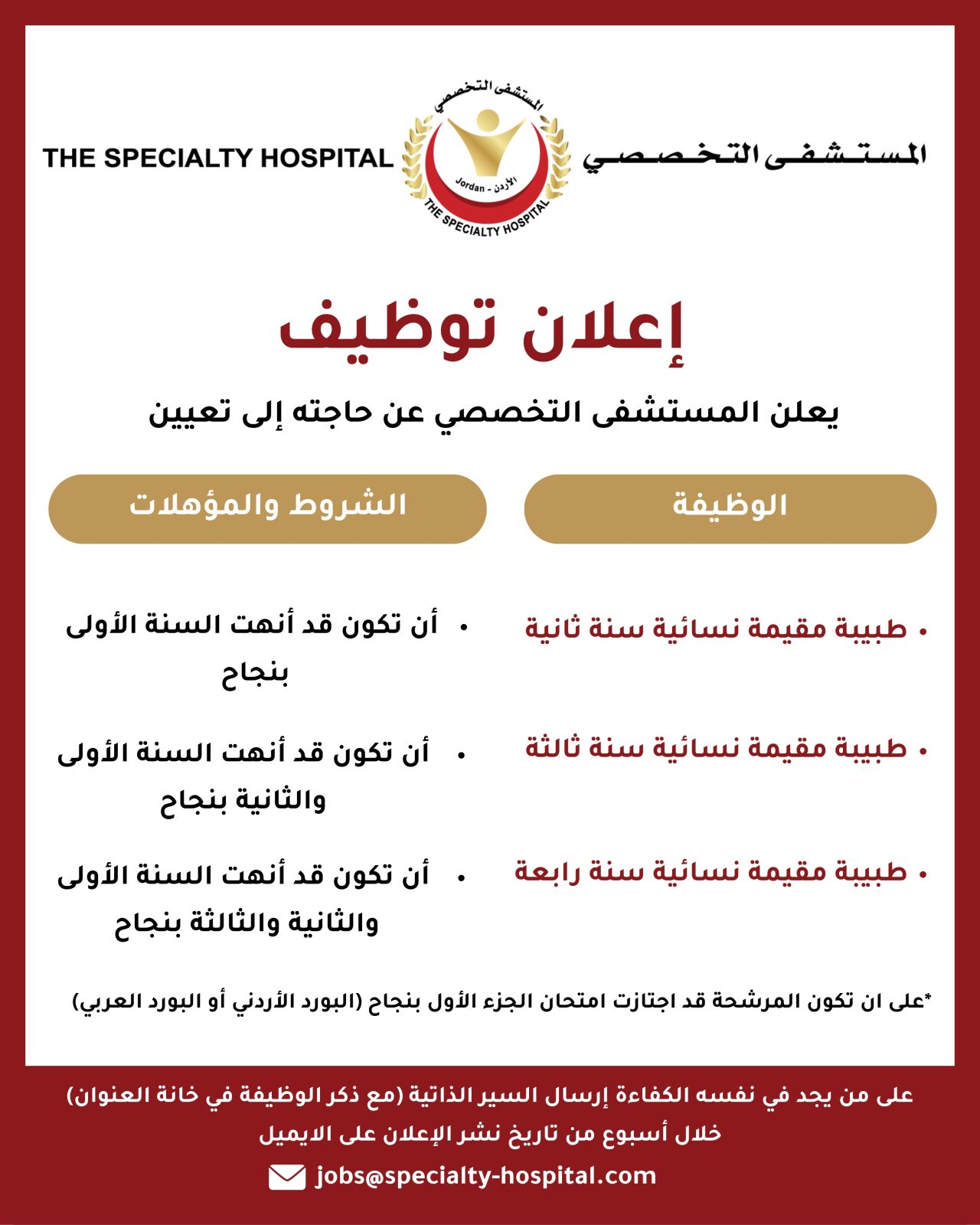 يعلن المستشفى التخصصي عن حاجته لتوظيف طبيبات مقيمات نسائيات وفقًا للمتطلبات التالية:
