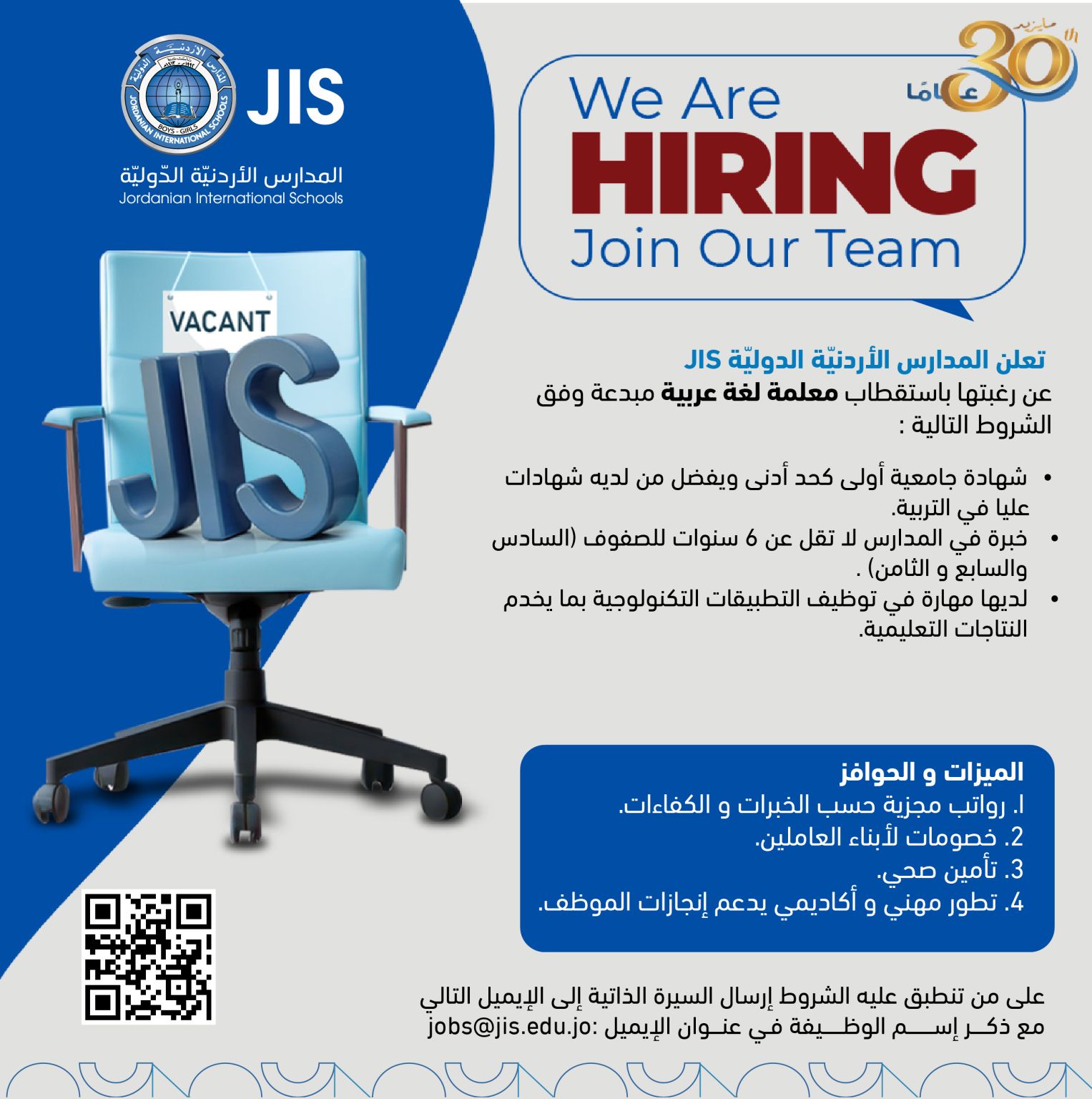تعلن المدارس الأردنية الدولية (JIS) عن حاجتها لتوظيف معلمة لغة عربية وفقًا للمتطلبات التالية: