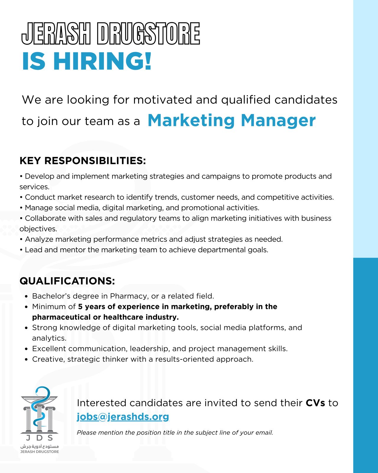هل لديك خبرة في التسويق؟ هل ترغب في الانضمام إلى فريق محترف وبيئة عمل ديناميكية؟ نقدم لك فرصة للعمل كـ مدير تسويق في صيدلية جرش.