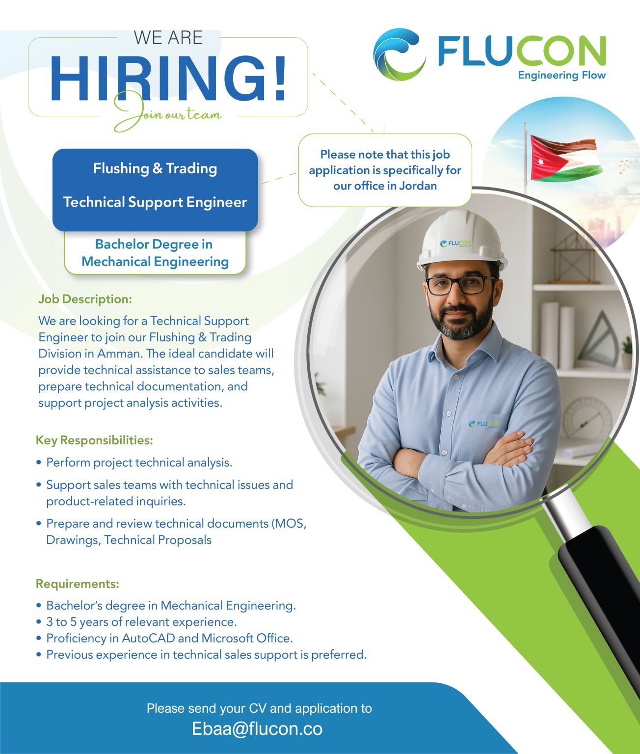 هل أنت مهندس ميكانيكي متحمس ولديك خبرة من 3 إلى 5 سنوات؟ نحن في FLUCON – Engineering Flow نبحث عن مهندس دعم فني للانضمام إلى فريقنا في عمان، الأردن.