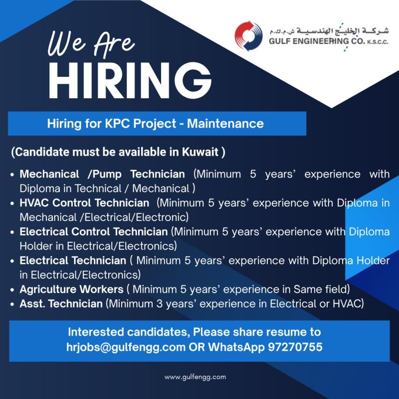 ✅ شركة الخليج الهندسية (Gulf Engineering Co.) تعلن عن فرص عمل مميزة في مشروع KPC – قسم الصيانة، للمرشحين المتواجدين في دولة الكويت.