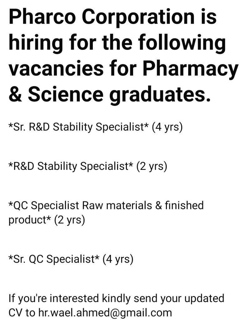 💊 Pharco Corporation تعلن عن فرص عمل مميزة لخريجي كليات الصيدلة والعلوم في عدة تخصصات داخل أقسام البحث والتطوير وضبط الجودة.