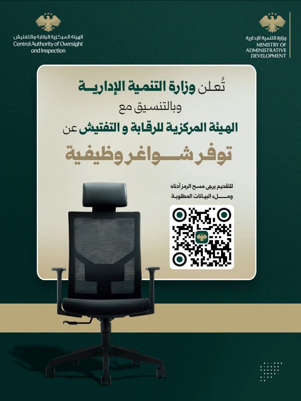 تُعلن وزارة التنمية الإدارية وبالتنسيق مع الهيئة المركزية للرقابة والتفتيش عن توفر شواغر وظيفية للمسميات التالية: