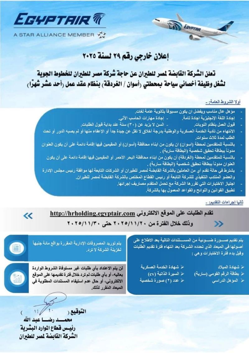 تعلن مصر للطيران عن فتح باب التقديم لشغل وظيفة أخصائي سياحة للعمل بمحطتي أسوان والغردقة بنظام عقد عمل لمدة أحد عشر شهرًا، وذلك ضمن إعلان خارجي رقم (29) لسنة 2025.