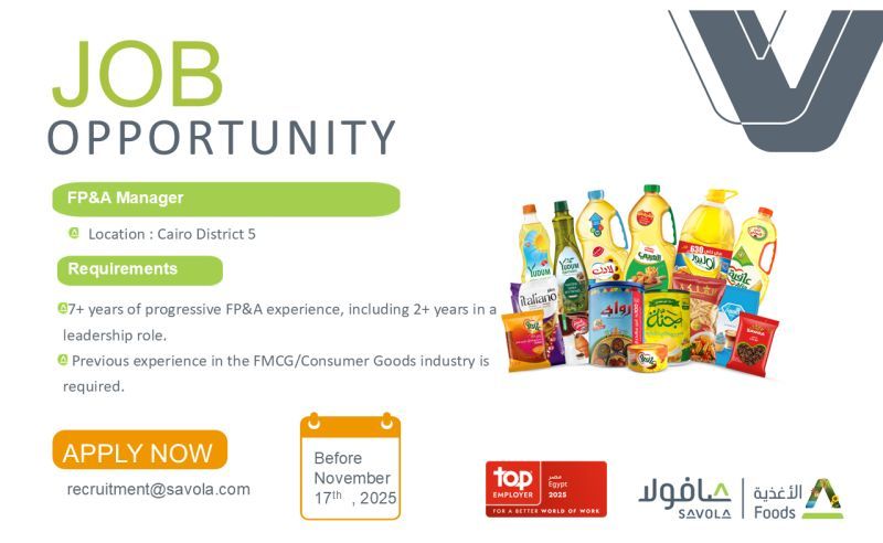 تعلن شركة Savola Foods، إحدى أبرز شركات السلع الاستهلاكية FMCG في المنطقة، عن توفر فرصة مميزة لشغل منصب FP&A Manager للعمل في حي القاهرة الجديدة – District 5.