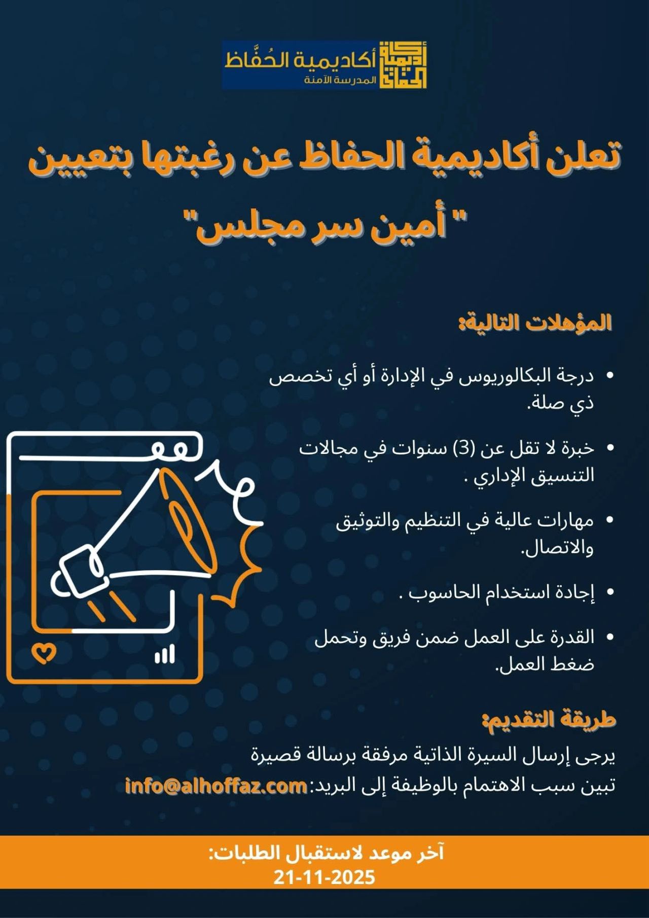 تعلن أكاديمية الحفاظ عن توفر شاغر وظيفي بمسمّى: أمين سر مجلس، وذلك ضمن بيئة عمل احترافية تبحث عن كفاءات تمتلك خبرة في التنسيق الإداري وإدارة الاجتماعات وتنظيم التقارير.