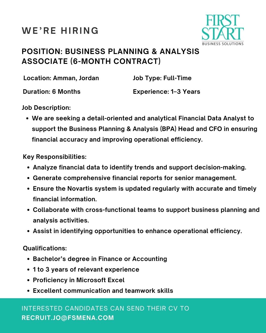 تعلن First Start Business Solutions عن توفر وظيفة Business Planning & Analysis Associate بعقد 6 أشهر، وهي من أبرز فرص العمل المميزة للخبرات المتوسطة في الأردن.