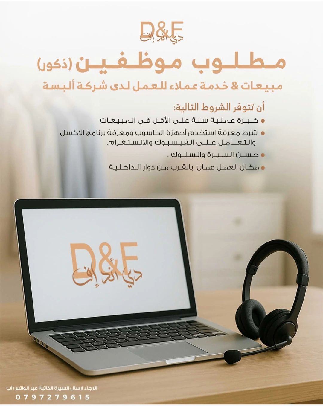 مطلوب موظفين مبيعات وخدمة عملاء (ذكور) للعمل لدى شركة ألبسة في عمّان، ضمن واحدة من أهم وظائف اليوم وفرص عمل الأردن 2025.