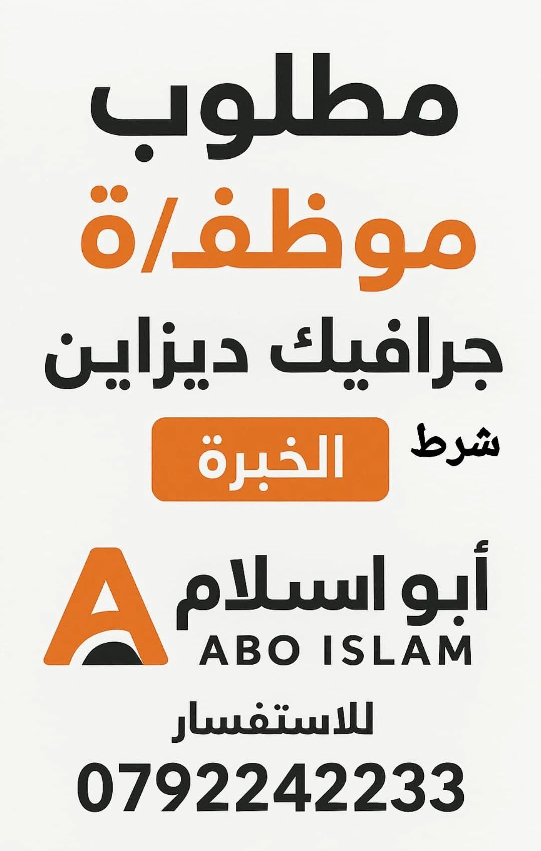 مطلوب موظف/موظفة جرافيك ديزاين للعمل لدى شركة أبو إسلام، مع توفر شرط الخبرة في مجال التصميم الجرافيكي واستخدام برامج التصميم الاحترافية.