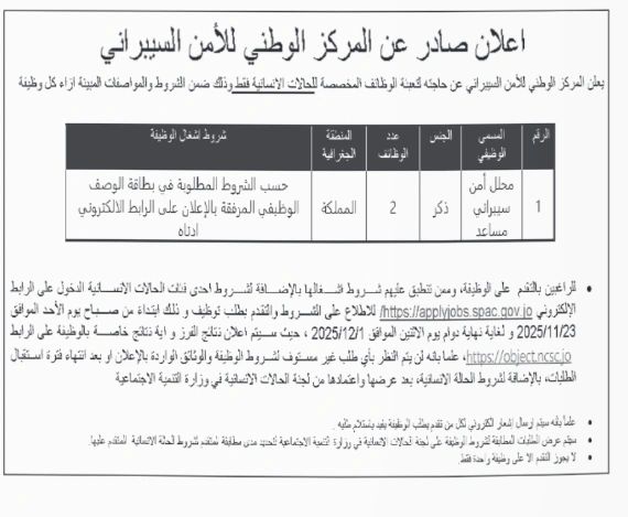 يعلن المركز الوطني للأمن السيبراني عن حاجته إلى تعيين محلل سيبراني مساعد لشغل وظيفة متخصصة في مجال الأمن السيبراني والحماية الرقمية، ضمن وظائف اليوم وضمن فرص عمل 2025 في الأردن.