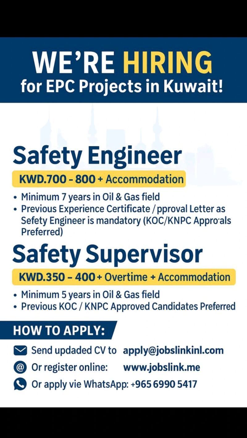 وظائف مهندسين ومشرفي سلامة في الكويت لمشاريع EPC برواتب ممتازة