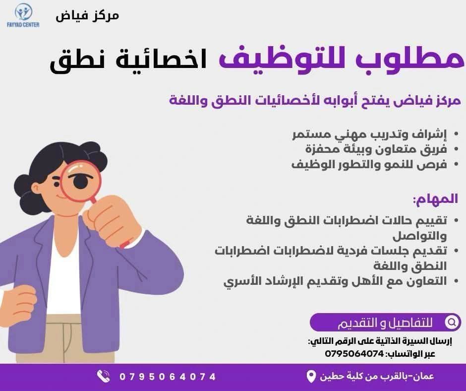وظيفة شاغرة: مطلوب أخصائية نطق ولغة للعمل في مركز فياض بعمان