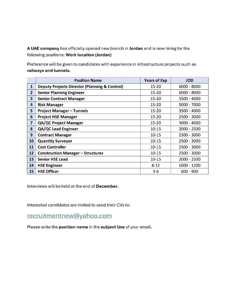 أعلنت شركة إماراتية رائدة عن افتتاح فرع جديد لها في الأردن، وتبحث حاليًا عن كوادر مميزة للانضمام إلى فريقها في عدد من التخصصات الهندسية والإدارية. تأتي هذه الفرص مع رواتب تنافسية وخبرة مفضلة في مشاريع البنية التحتية مثل السكك الحديدية والأنفاق.