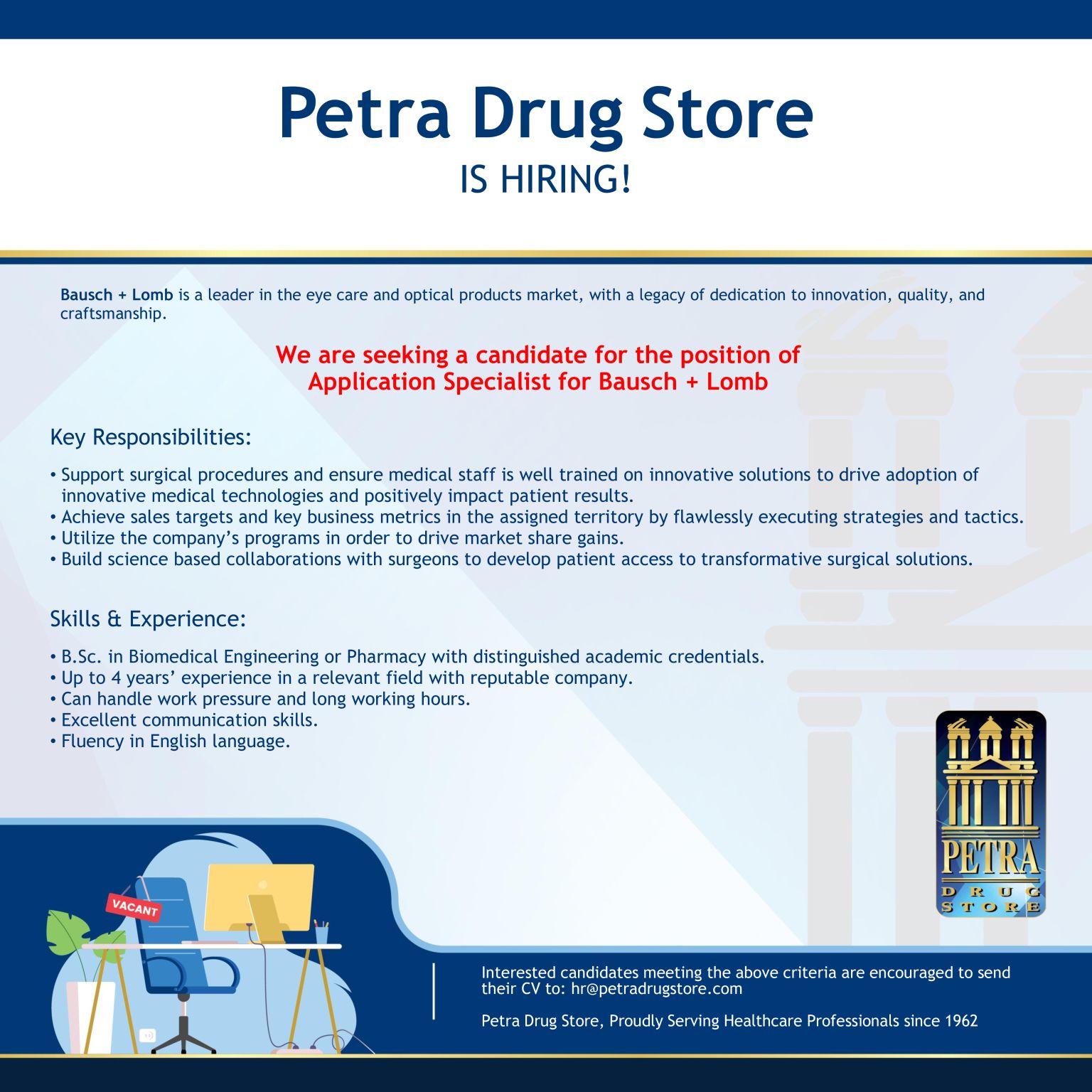 تعلن Petra Drug Store عن حاجتها لتعيين أخصائي تطبيقات (Application Specialist) لصالح شركة Bausch + Lomb الرائدة في تقنيات العناية بالعيون والمنتجات البصرية.