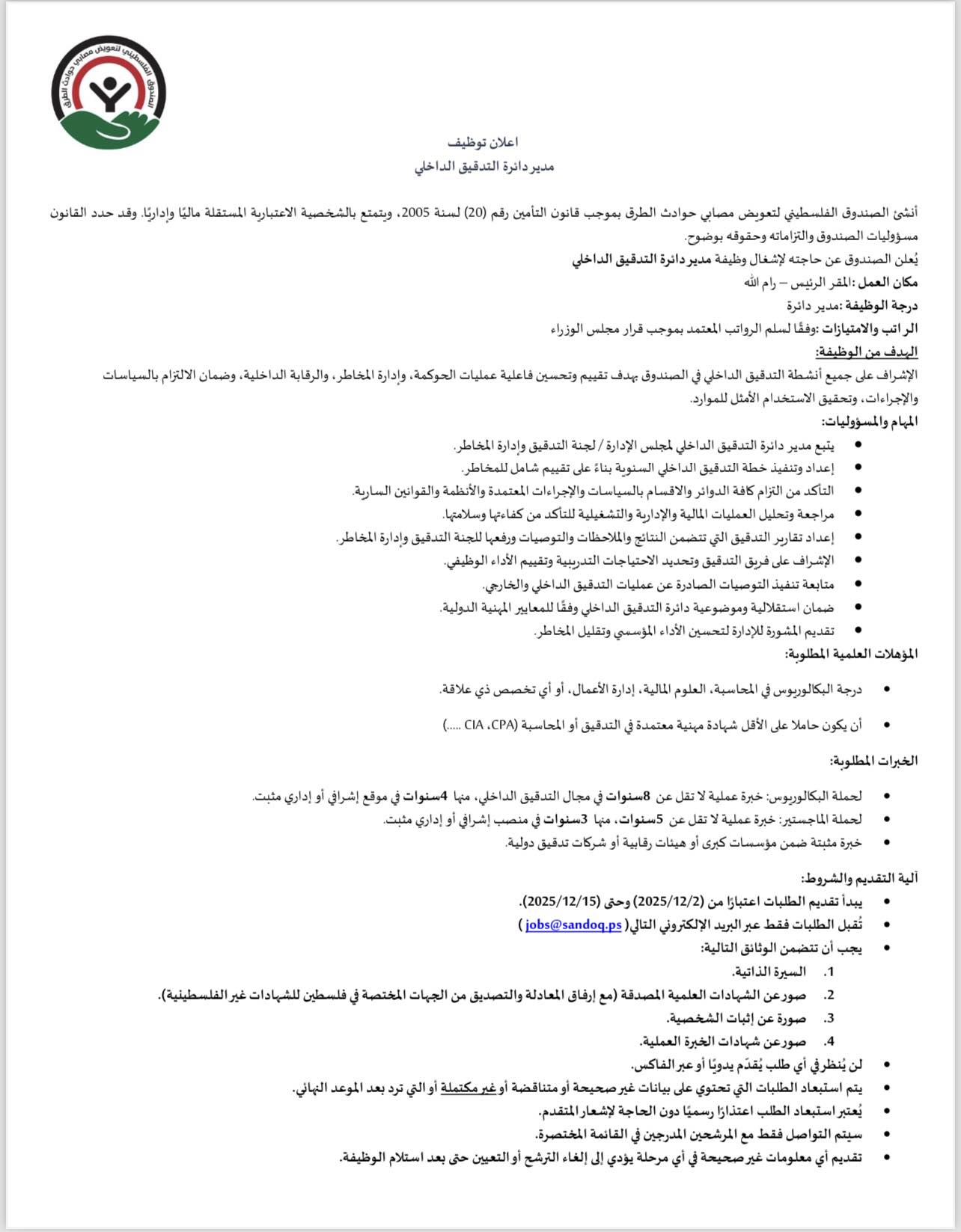 يعلن الصندوق الفلسطيني لتعويض مصابي حوادث الطرق عن حاجته لشغل وظيفة مدير دائرة التدقيق الداخلي، لمتابعة وتقييم وتحسين جميع أنشطة التدقيق الداخلي بالصندوق.