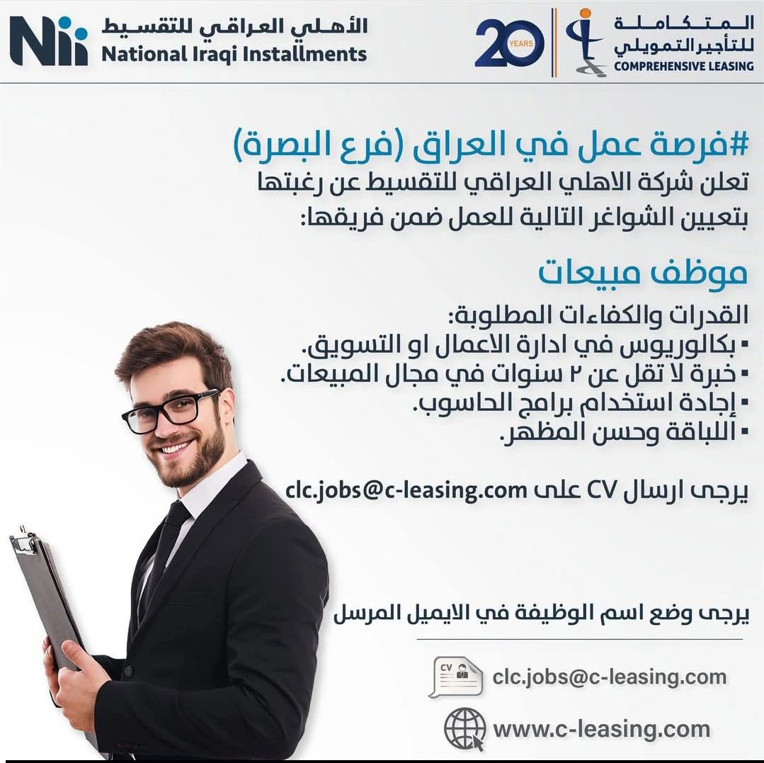 تعلن شركة الأهلي العراقي للتقسيط عن حاجتها لتعيين موظف مبيعات في فرع البصرة للعمل ضمن فريق متميز في تقديم خدمات التمويل والتقسيط للعملاء.