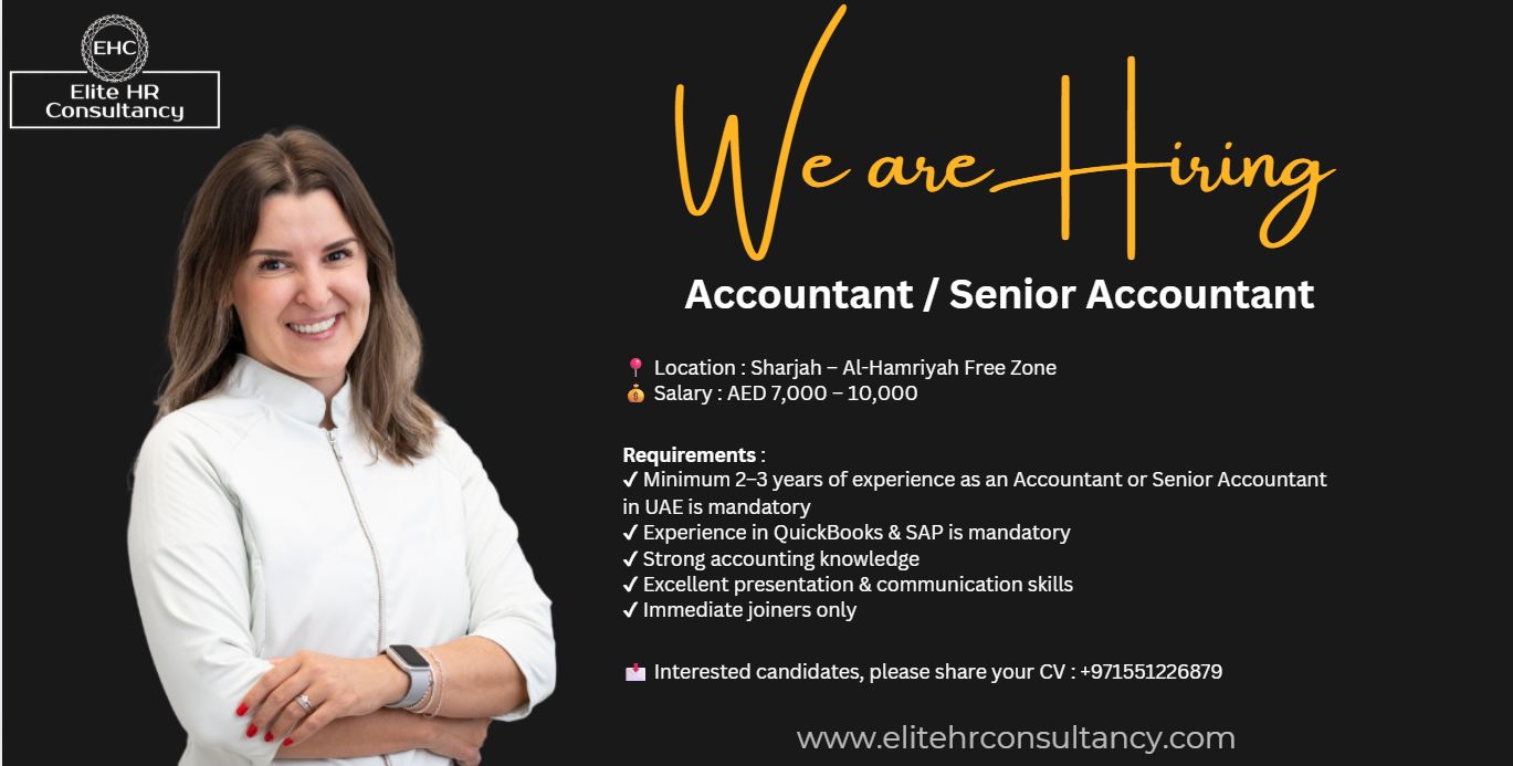تعلن Elite HR Consultancy عن توفر فرصة عمل مميزة في إمارة الشارقة – منطقة الحمرية الحرة لشغل وظيفة محاسب / محاسب أول ضمن بيئة عمل احترافية ورواتب تنافسية.