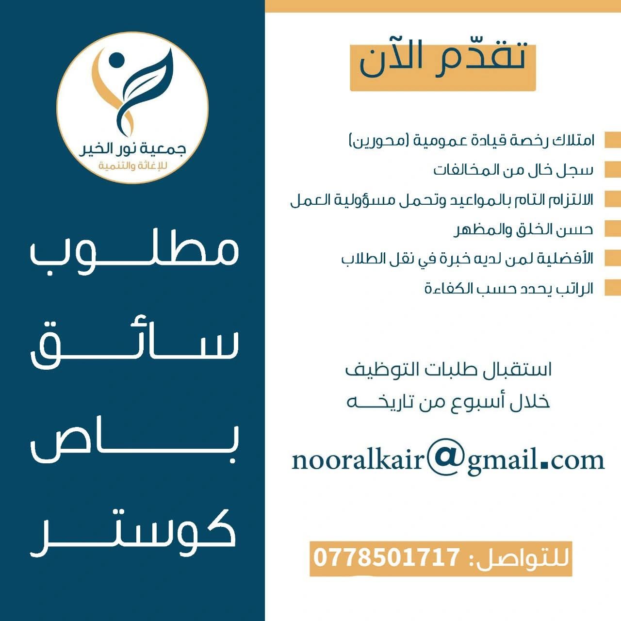 مطلوب سائق باص كوستر براتب مجزٍ – فرصة عمل فورية لدى جمعية نور الخير